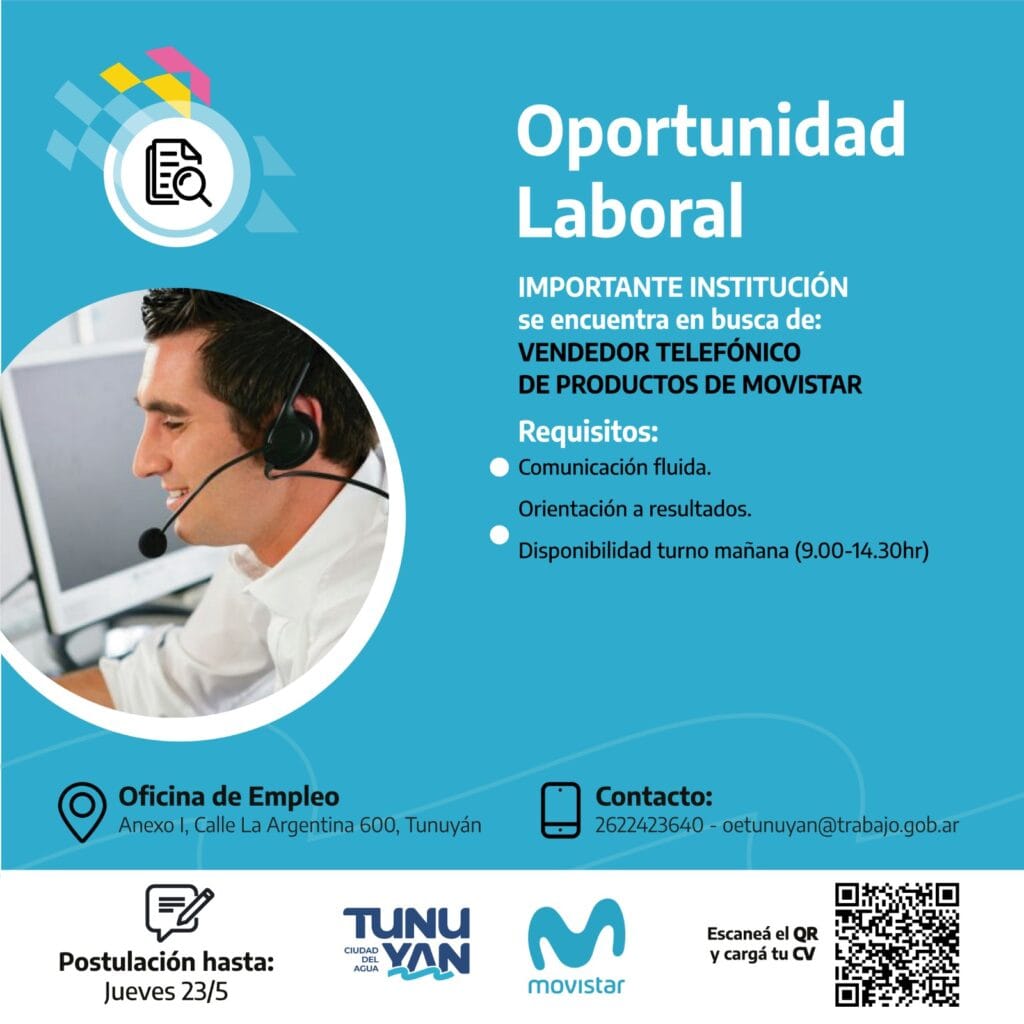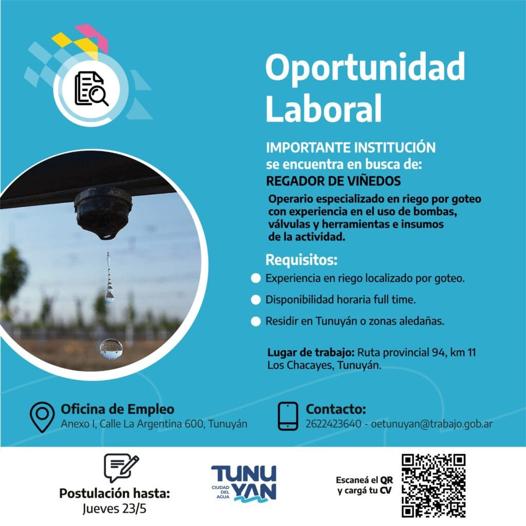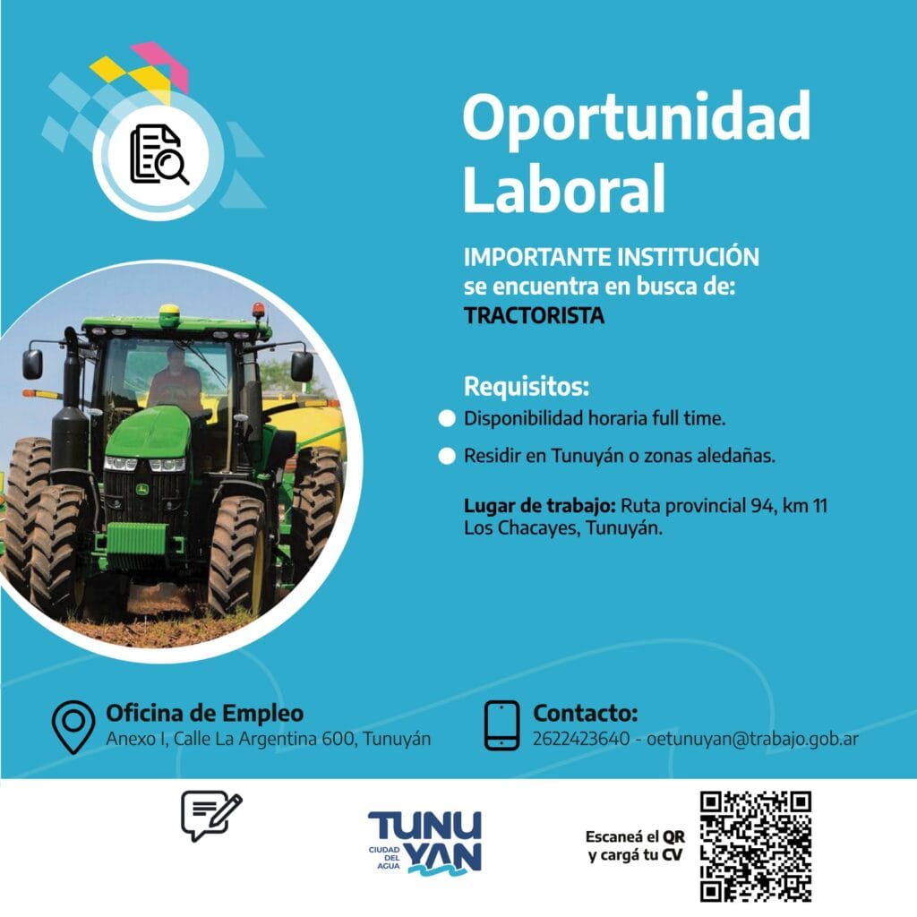 La Municipalidad de Tunuyán a través de la Oficina de Empleo compartió diferentes oportunidades laborales.