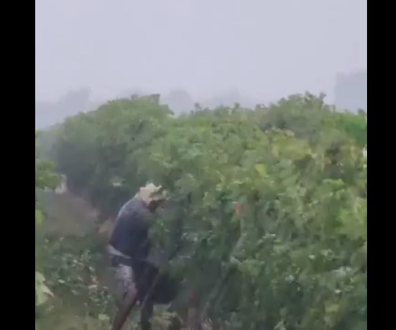 Un cosechador enfrentó la fuerte tormenta desde las hileras