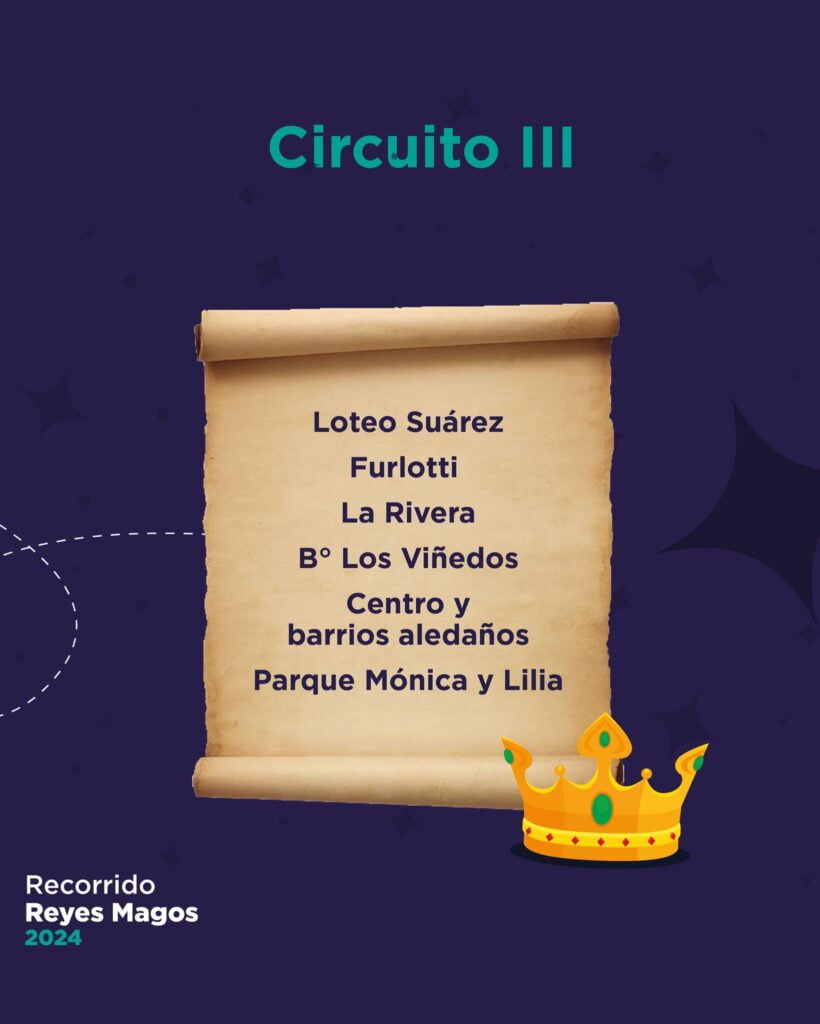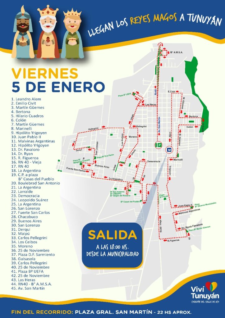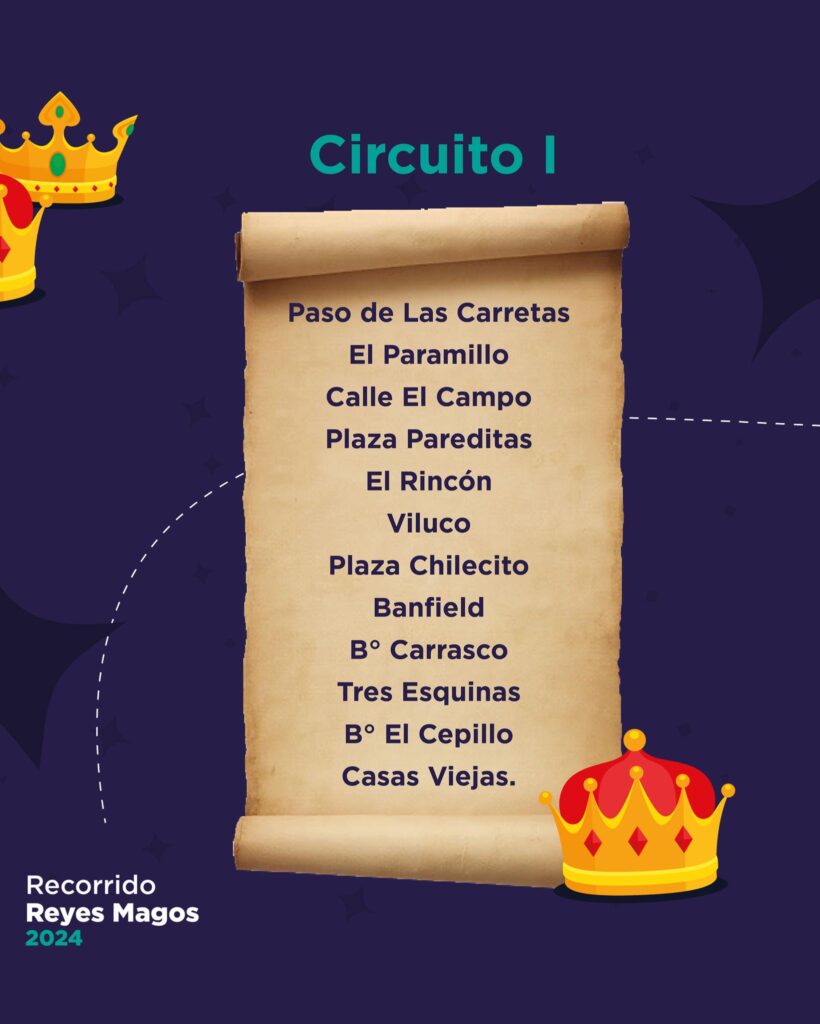 Este viernes 5 de enero, los reyes comenzarán su recorrido desde las 17 horas. El recorrido número 1 comprende, Paso de Las Carretas, El Paramillo, calle El Campo, Plaza Pareditas, El Rincón, Viluco, Plaza Chilecito, Bandfield, B° Carrasco, Tres Esquinas, B° El Cepillo, Casas Viejas.