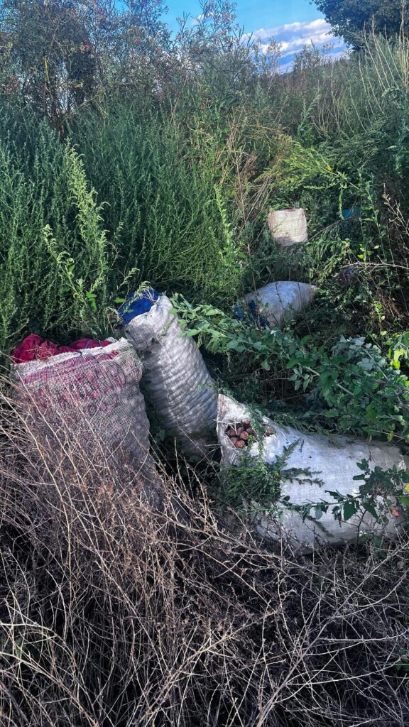 Una vez reducidos los masculinos, se comienza un rastrillar por la zona, debido a la presencia de malezas altas, logrando ubicar cinco bolsas de nueces de 50 kg cada una, dos recolectores y tres mochilas conteniendo todo nueces.