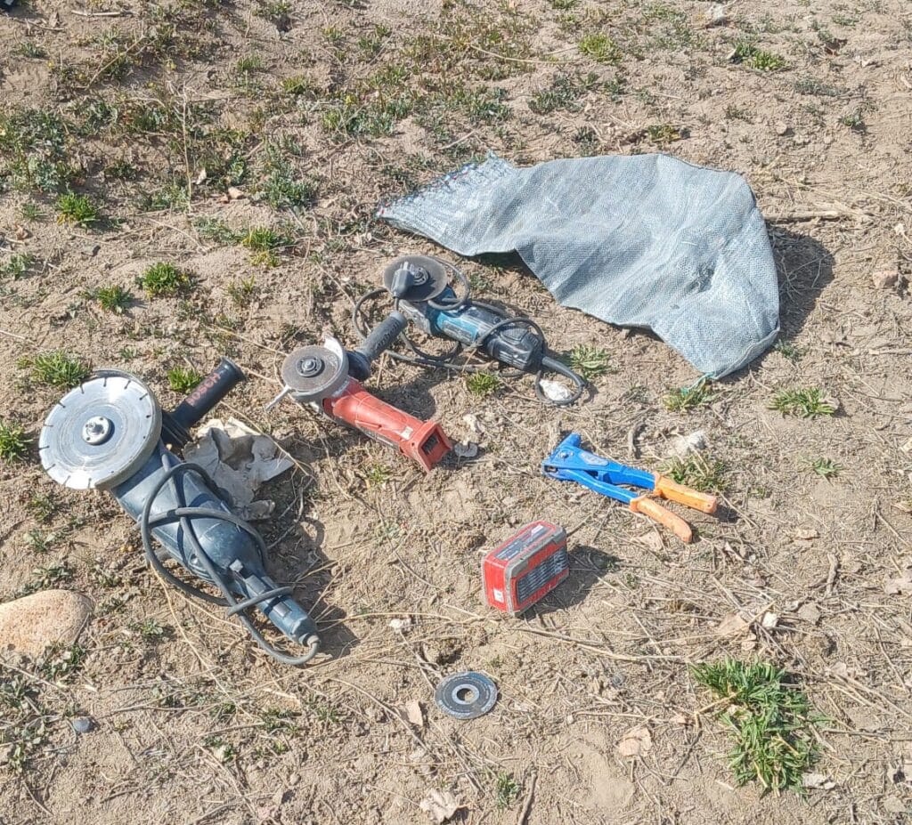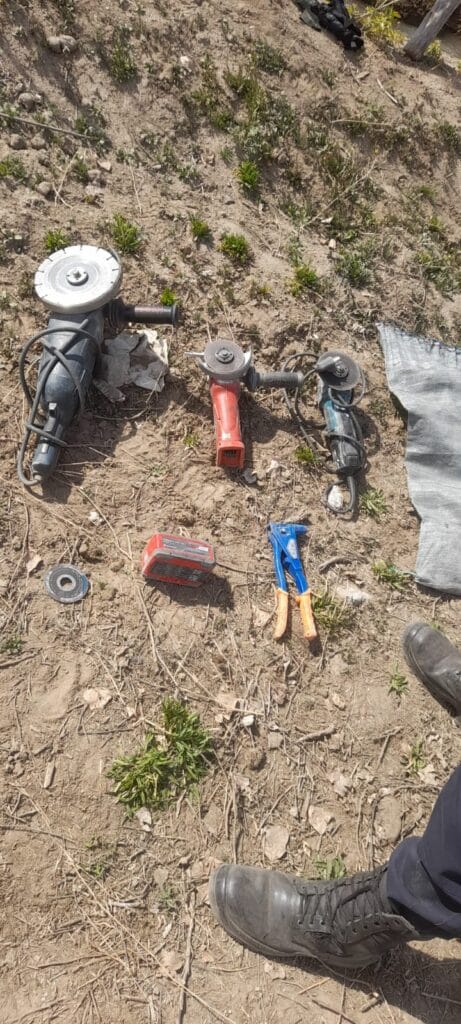 Advertido por la presencia policial, intentó darse a la fuga, pero fue reducido en el interior de una finca. Se logró recuperar varias herramientas entre ellas, una amoladora industrial con disco diamantado, amoladora de mano amoladora de mano color roja con batería y una remachadora de mano.