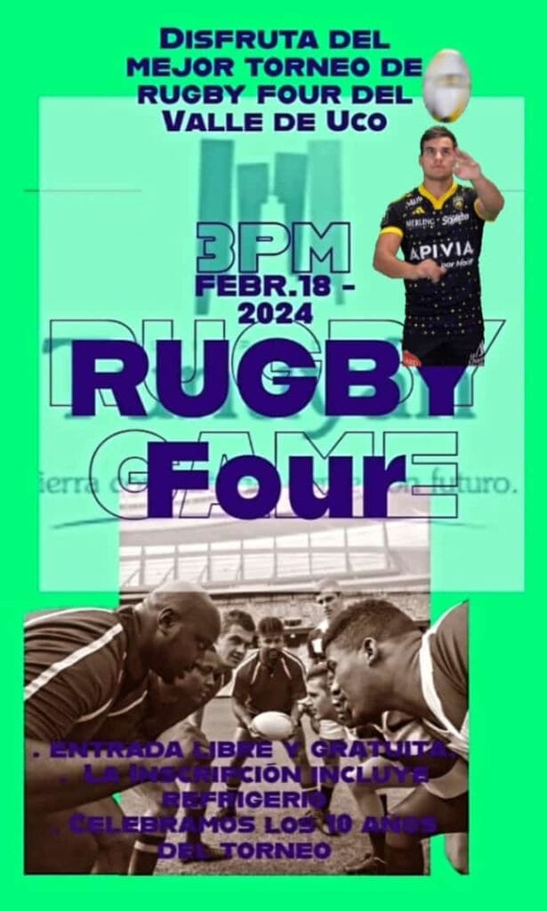 Se viene una actividad deportiva, gratuita, que tendrá lugar en el Valle de Uco. El próximo 18 de febrero se podrá disfrutar del torneo rugby four. Se realizará en el predio ubicado en calle Arturo Ilia, en inmediaciones de escuela ENET.