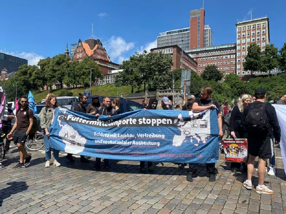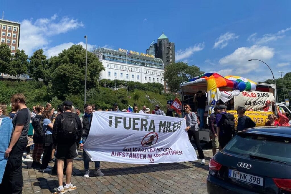 Grupos de izquierda y antifascistas alemanas, y de organizaciones de inmigrantes latinoamericanos se manifestaron al grito de “¡Nain fur Milei in Hamburg”, “no a Milei en Hamburgo, no a Milei en Alemania! ¡No los queremos!”.
