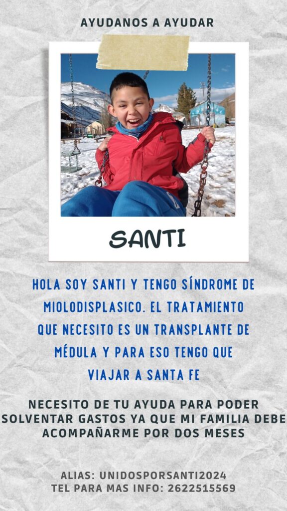 Santi tiene 9 años, vive en el departamento de Tupungato y desde hace dos años fue diagnosticado con Síndrome Miolodisplasico. Actualmente recibe atención en el Hospital Notti, pero para mejorar su salud y calidad de vida debe someterse a un trasplante de médula.