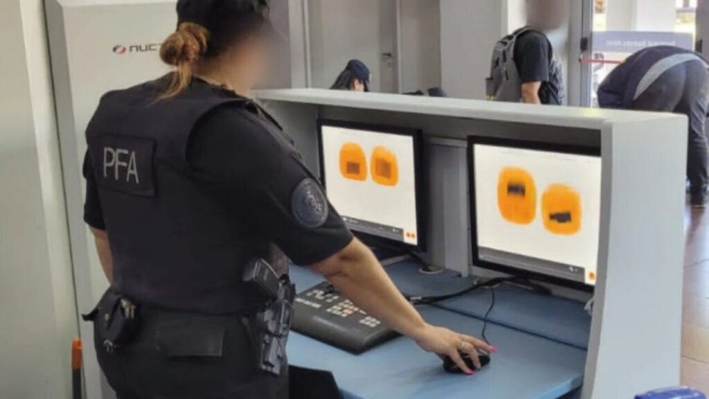 El hecho se produjo cuando uno de los changarines se acercó a la zona del escáner con dos bultos y al pasarlos por la cinta del equipo, los efectivos observaron en la pantalla varios paquetes rectangulares, los que se encontraban disimulados entre calzados y prendas de vestir.