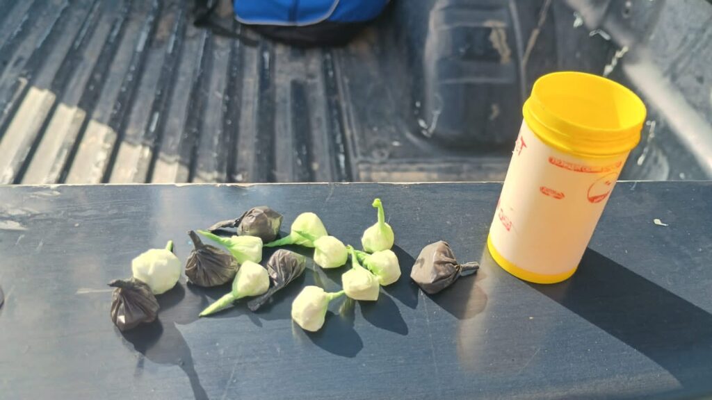 Rápidamente se los aprehende, se les hace un palpado de sus prendas frente a la cámara policial de la movilidad donde estos acceden, y son trasladarlos a sede de Subcomisaría Cordón del Plata para averiguación de sus antecedentes, ya en la movilidad se procede a realizar un rastrillaje en la zona donde se encontraba el masculino logrando visualizar, un total de 14 envoltorios de cocaína.
