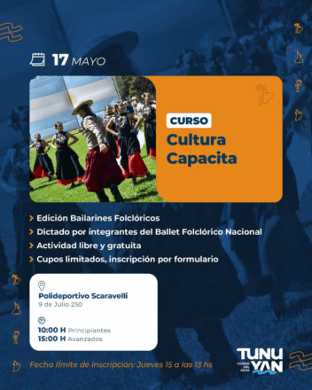 El próximo 17 de mayo, la Municipalidad de Tunuyán ofrecerá una capacitación gratuita para bailarines folclóricos, principiantes y avanzados. Será en las instalaciones del Polideportivo Scaravelli, i, ubicado en 9 de Julio 250, a partir de las 10:00 HS (principiantes) y a las 15:00 HS (avanzados), sin ningún costo. Los encargados de dictar esta capacitación serán reconocidos bailarines del Ballet Folklórico Nacional.