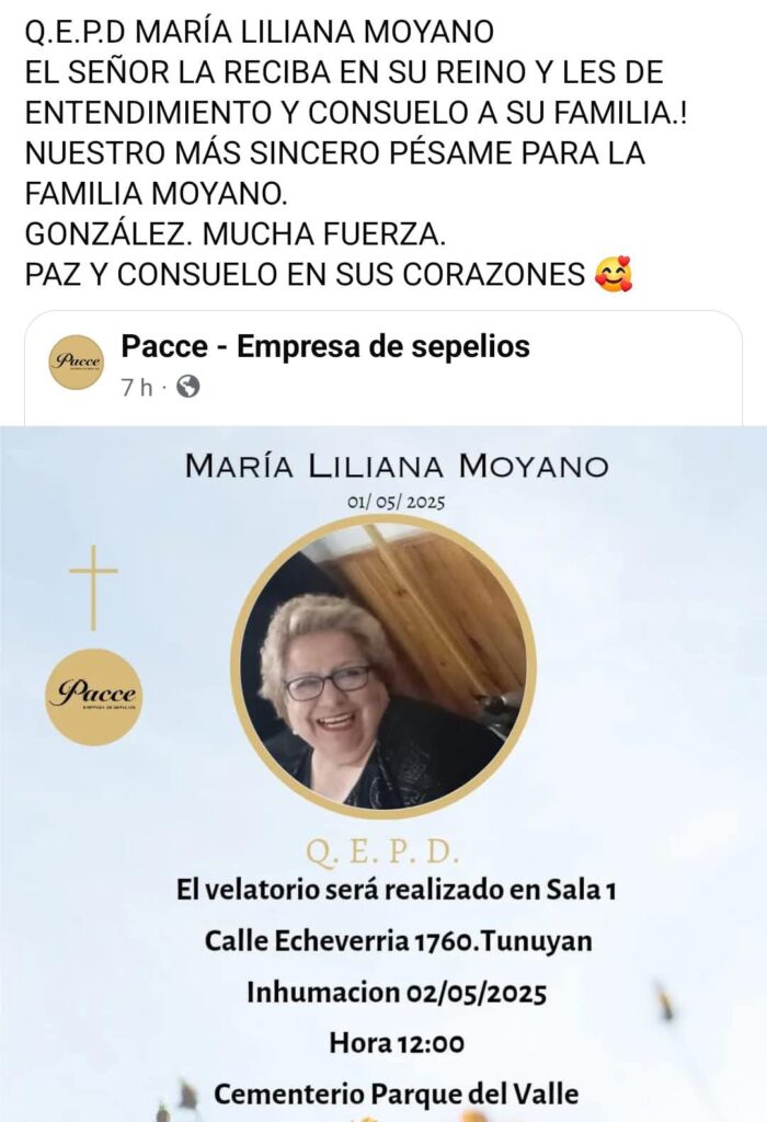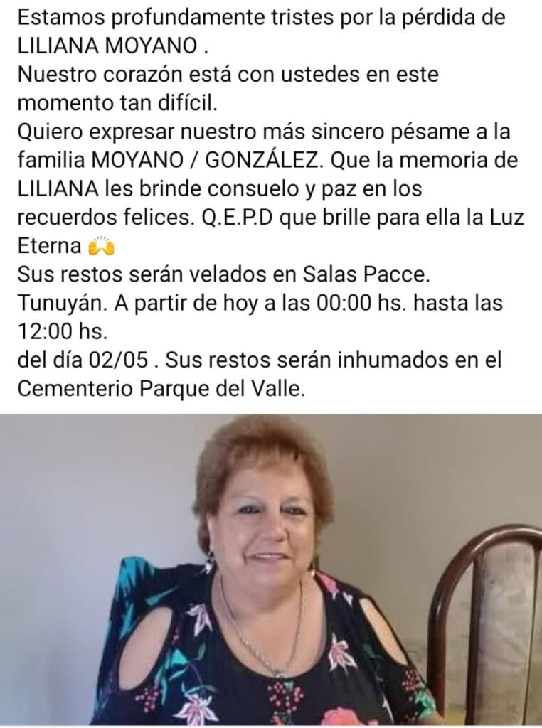 A causa del fuerte impacto, perdió la vida una querida vecina del departamento de Tunuyán, Liliana Moyano. Una incansable defensora de sus raíces y el folklore. Liliana tenía 68 años, y una gran familia que hoy la despide.