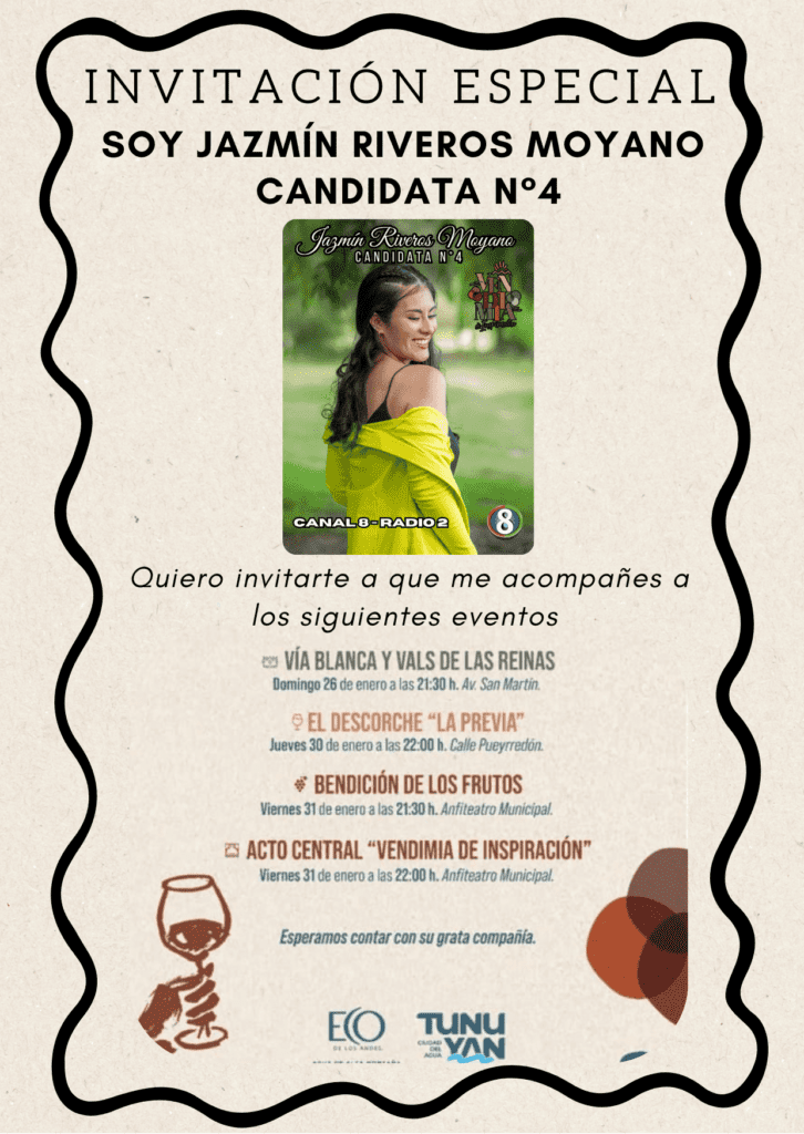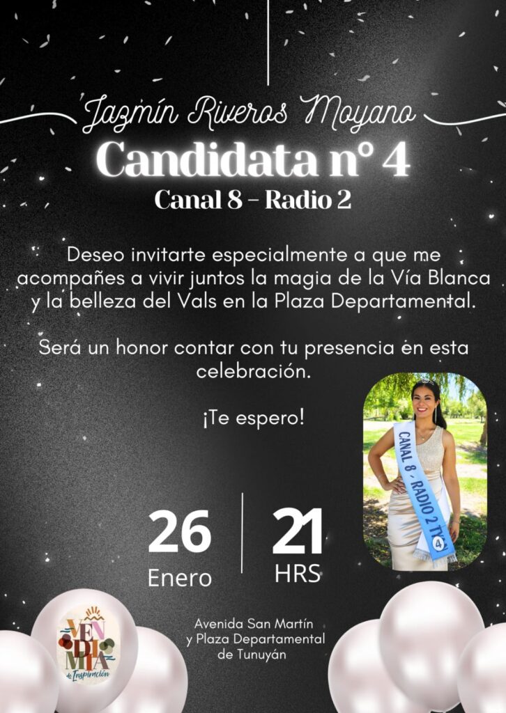 En la noche de hoy, a las 21:00h por la Avenida San Martín de Tunuyán, se vivirá la Vía Blanca de las Reinas, y Jazmín Riveros Moyano, Candidata N°4, representante de Canal 8 y Radio 2, invita al público a participar y a acompañarla.