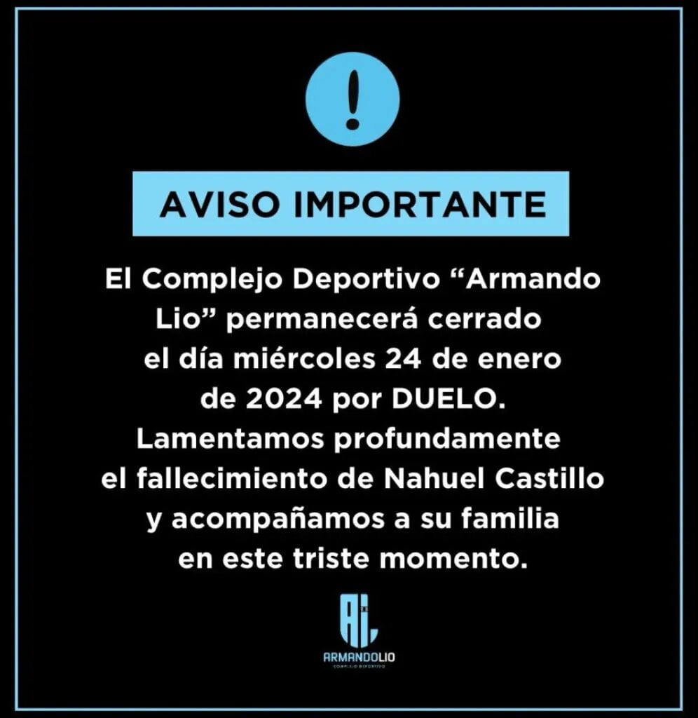 Desde el complejo de canchas, decretaron duelo, durante este miércoles permanecerá cerrado. «Lamentamos profundamente el fallecimiento de Nahuel Castillo, y acompañamos a su familia en este triste momento», difundieron en un comunicado.