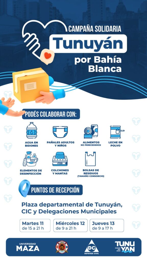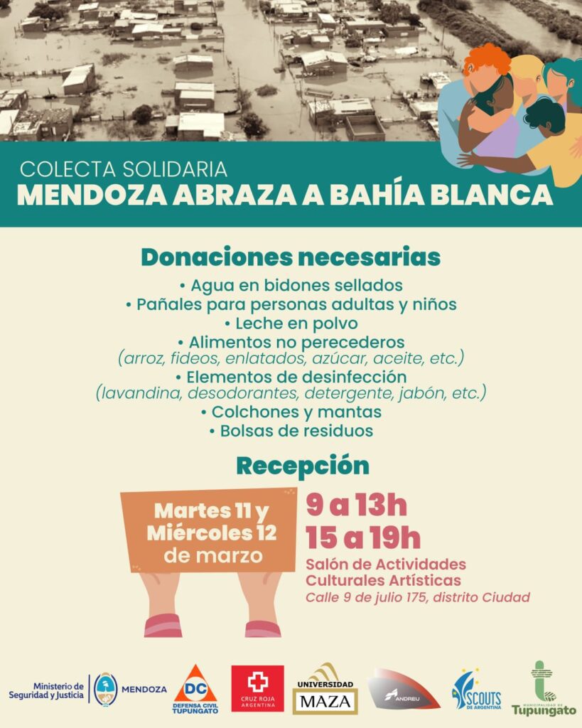 «Invitamos a toda nuestra comunidad a compartir y acercar todo lo que pueda donar para llevar un poco de alivio a quienes más lo necesitan. En momentos de adversidad, la solidaridad se convierte en un lazo que nos une y trasciende. Tupungato extiende su mano amiga a Bahía Blanca, sumándose con amor y esperanza a esta colecta. Cada pequeña acción, cada gesto de generosidad, tiene el poder de transformar vidas», manifestaron desde la comuna.