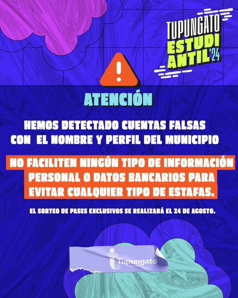 En un importante comunicado, el municipio de Tupungato alertó, «hemos detectado una cuenta falsa con el nombre y perfil del Municipio. En comentarios aleatorios han anunciado falsos ganadores, tengan en cuenta que tal como se comunicó el sorteo se realizará el Sábado 24 de agosto por la página oficial que es Tupungato Argentina».