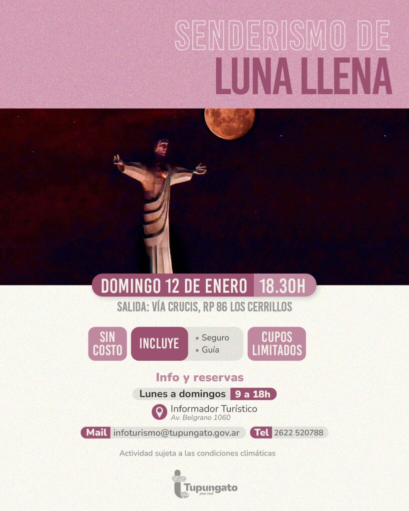 Tupungato tiene preparada una gran actividad para el disfrute, este domingo 12 de enero a las 18.30h, con salida desde el inicio del Vía Crucis del Cristo Rey del Valle, se desarrollará esta propuesta turística gratuita. Se trata de senderismo de luna llena.