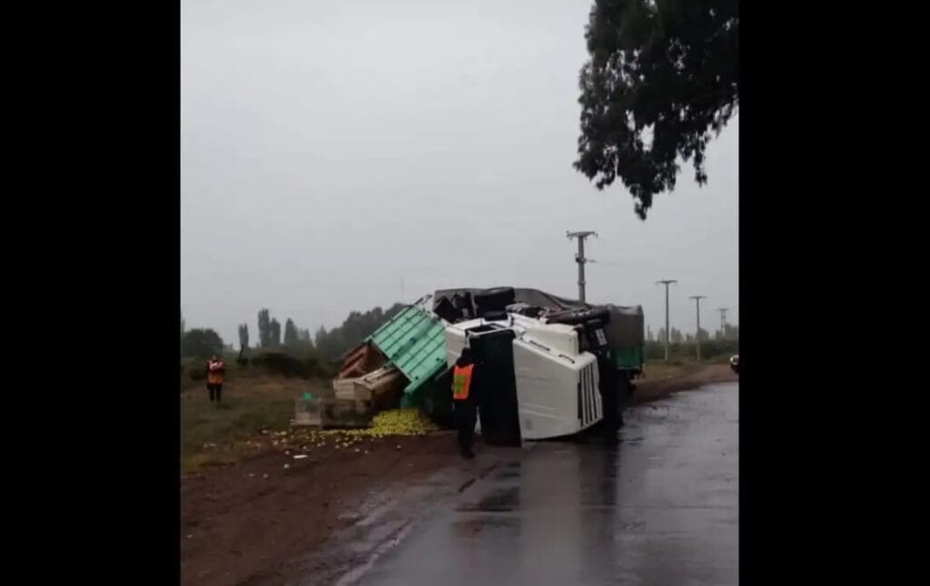 Un camión volcó esta mañana en la ruta 171, en cercanías de Monte Comán, San Rafael, presuntamente por las condiciones climáticas. Se trata de un Scania 113 con semiremolque, estaba cargado con frutas.