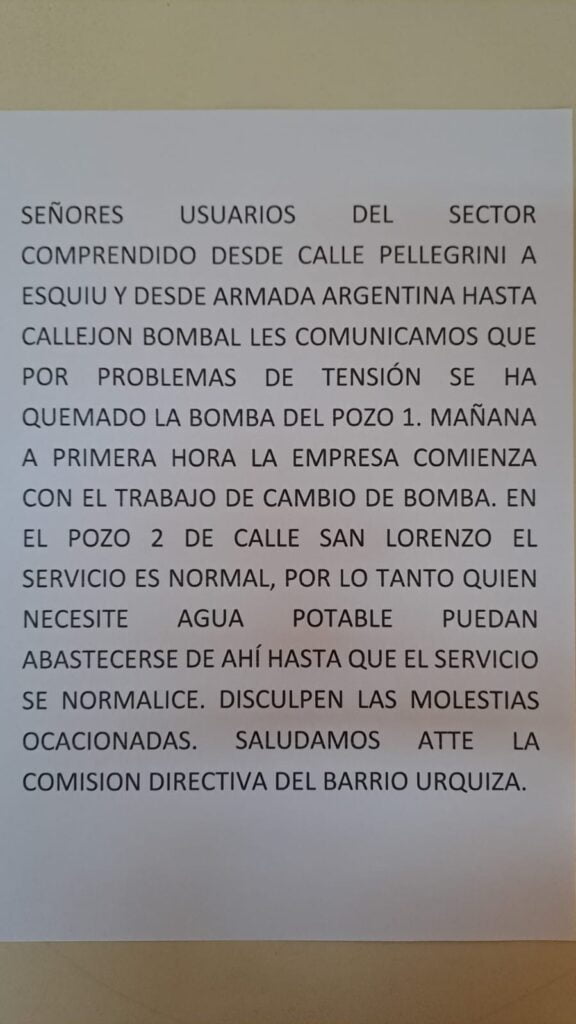 «Les comunicamos que por problemas de tensión se ha quemado la bomba del pozo 1», detallaron. Esto afectará directamente, a los vecinos residentes desde calle Pellegrini, a Esquiu y desde Armada Argentina hasta callejón Bombal.