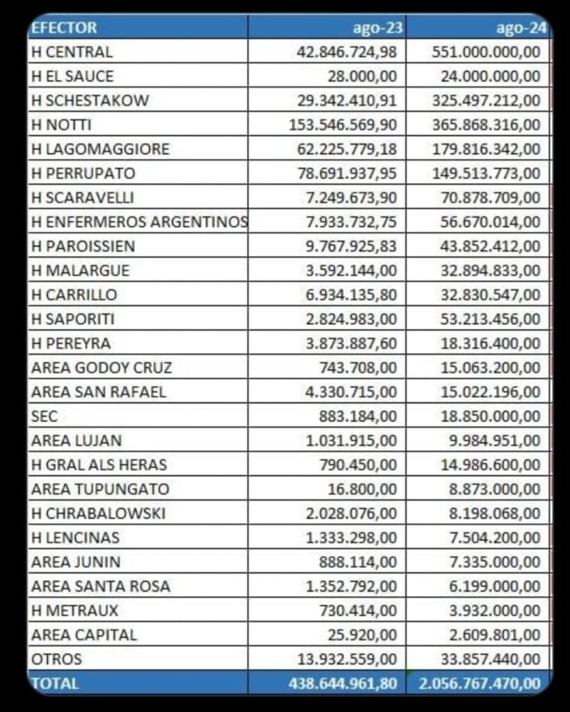 En la lista de nosocomios encabezada por mayor recaudación, con el Hospital Central, Notti y Schestakow, también aparece el Hospital Scaravelli en Tunuyán y el área de salud de Tupungato.