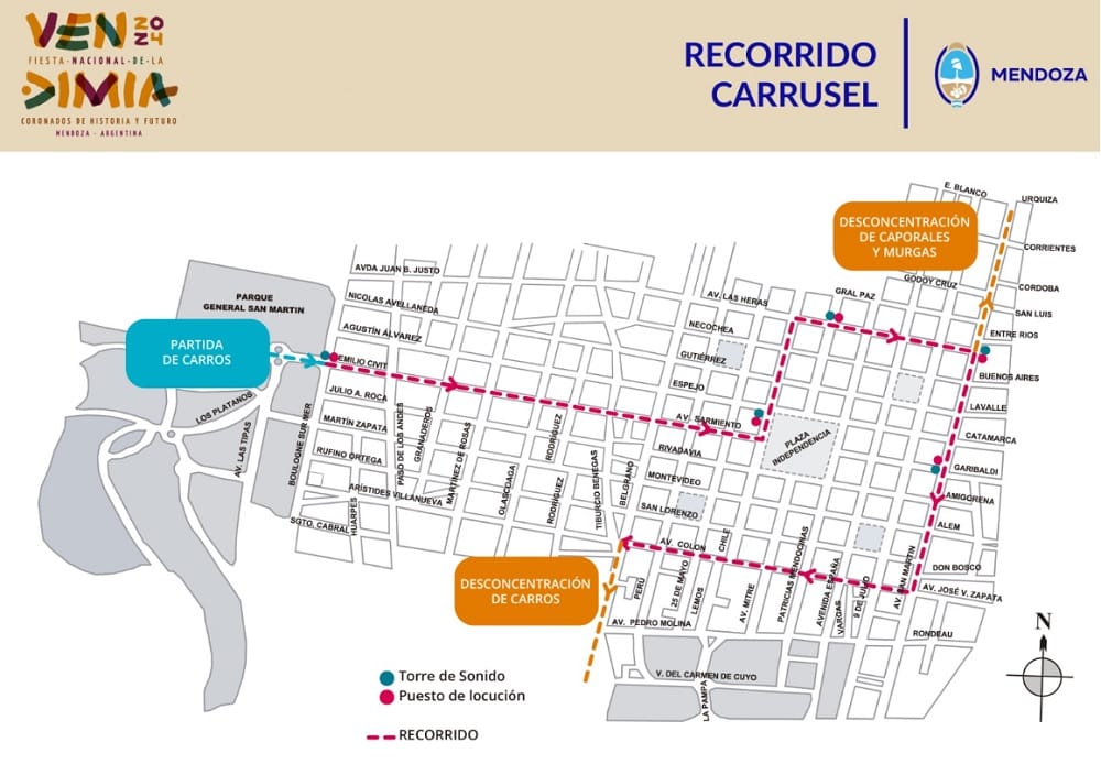 El Carrusel será al día siguiente -el sábado 2- y comenzará a las 10. Partirá desde los Portones del Parque, se dirigirá hacia el este por Emilio Civit hasta la plaza Independencia; allí doblará hacia el norte por Chile hasta Las Heras; de ahí hasta San Martín hacia el sur, luego doblará por Colón, para desconcentrar en calle Belgrano.