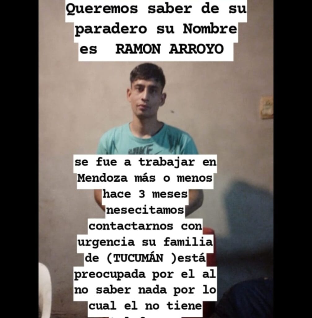 Ramón Antonio Arroyo, es oriundo de Tucumán viajó a Mendoza hace tres meses y su familia perdió todo contacto con él desde entonces.