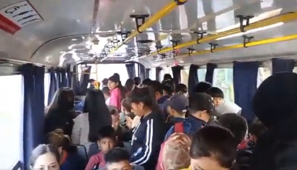 «En todo el recorrido van subiendo estudiantes y docentes», aseguraron y compartiendo las imágenes que muestra a menores de edad viajando parados e incluso sentados en las escaleras de la puerta trasera.