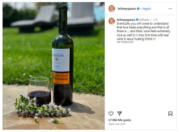 La botella que publicó pertenece a un Malbec Reserva, cosecha 2019, de la Bodega Norton, una conocida empresa vitivinícola mendocina que cuenta con viñedos en diferentes puntos de la provincia. En Estados Unidos, donde vive Spears, la botella cuesta entre 17 y 18 dólares, es decir, unos 18.000 pesos argentinos, de acuerdo con el cambio blue actual.