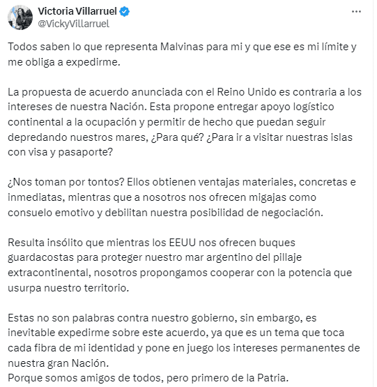 En un posteo en X, Villarruel expresó: “La propuesta de acuerdo es contraria a los intereses de nuestra Nación. Se permite a los británicos continuar explotando nuestros recursos mientras nosotros obtenemos mínimas concesiones.”