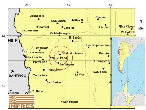 Precisamente ocurrió a 44 km al E de Mendoza; 151 km al S de San Juan; 13 km al S de Costa De Araujo.