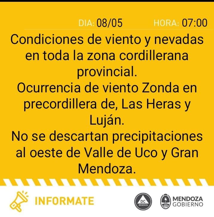 Tampoco, se descartan precipitaciones al oeste del Valle de Uco y Gran Mendoza.