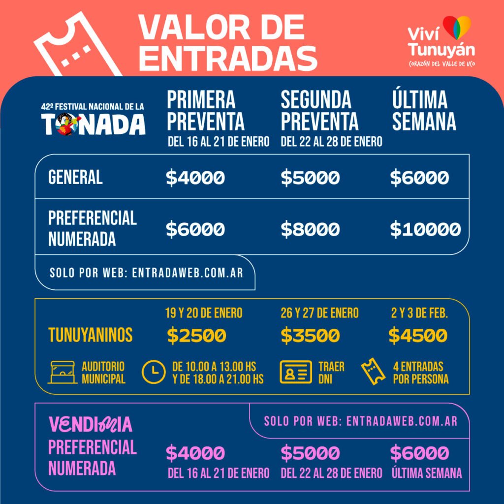 Por otro lado, los tunuyaninos podrán comprar sus entradas al la noche de Tonada, con precio diferenciado, en esta segunda preventa por un monto de $3500. Deben acercarse de 10 a 13 y de 18 a 21 h al Auditorio Municipal, presentando el DNI y se venderán 4 entradas por persona.